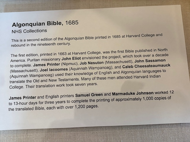 The Society also holds a full second edition of the Algonquin Bible, printed at Harvard College in 1685. This second printing was produced only 22 years after the original. To have a complete second edition copy in Natick gives this community a personal connection to its earliest history.