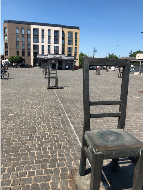 In 2019, we visited Ghetto Heroes Square in Krakow, a wide-open public square that today holds striking memorial installations. Scattered across the space are dozens of oversized bronze chairs: simple, empty, and haunting. The installation, created in 2005 by Lewicki and Latak, stands as a memorial to the Jewish residents of the Krakow Ghetto who once lived and worked here during the years of WWII.