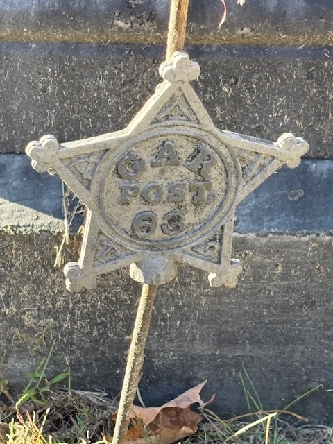 The first type I noticed was the five-pointed star with small stars in each point and the letters GAR 1861-1865 in the center. This is the standardized GAR grave marker that began appealing in the 1880s. It was placed to identify any Union veteran, and the dates mark the span of the Civil War.